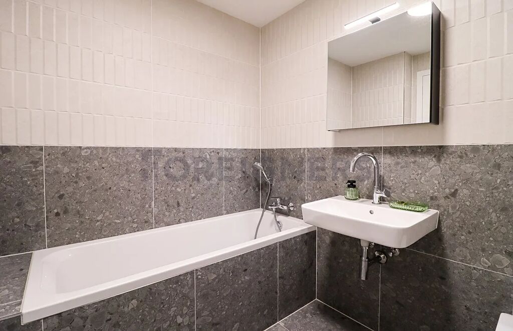 Koupelna vyniká elegantním designem a praktičností, kromě vany, umyvadla a WC je zde umístěna také pračka.