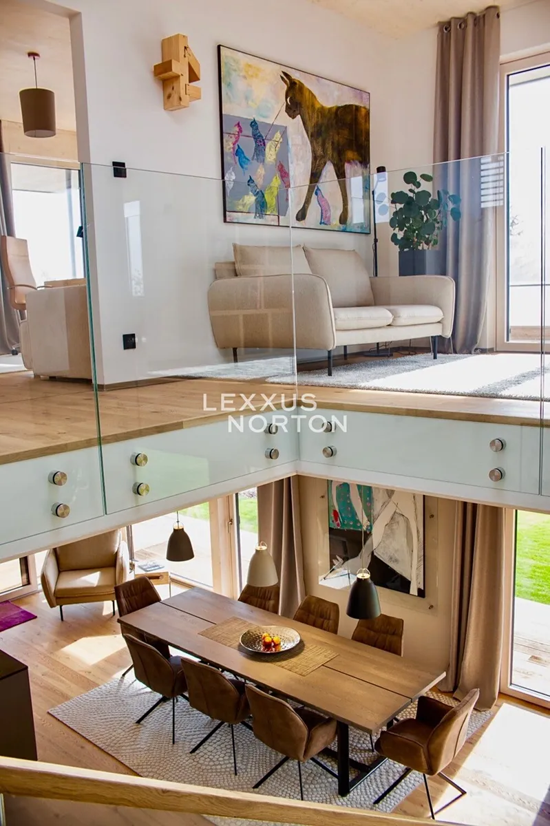 Dům je nízkoenergetický - trojité zasklení ve dřevohliníkových oknech od rakouského prémiového dodavatele Katzbeck, tepelné čerpadlo SA-Etech, podlahové vytápění Herz, kartáčované dubové podlahy Admonter, šatny Schmalenbach, sanitu v koupelnách značky Hans-Grohe a kuchyně Poggenpohl s kuchyňskými spotřebiči zn. Gaggenau + Dornbracht. Zahrada má automatické zavlažování a 2 retenční nádoby na vodu. Nyní se ještě na garáži kompletuje fotovoltaika s bateriemi a WallBoxem pro dobíjení elektromobilů.