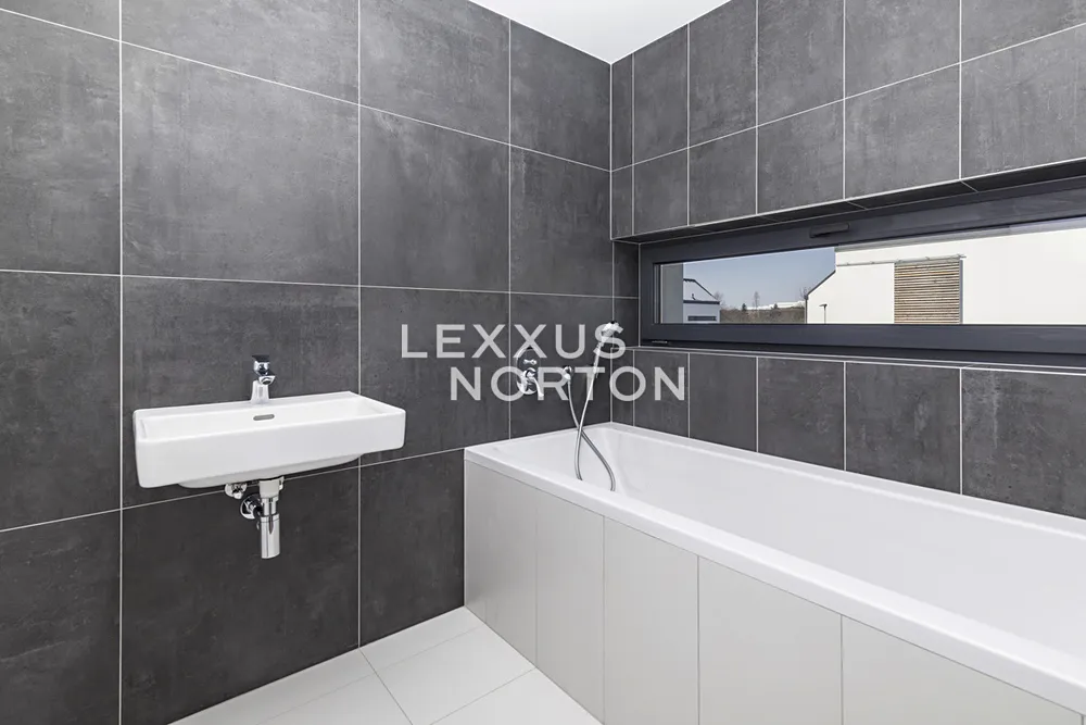 V domě je použita kvalitní sanita značky LAUFEN, která vyniká moderním designem a dlouhou životností. Vanové baterie a sprchový set HANSGROHE dodávají koupelnám prémiový vzhled a maximální komfort. Pro zvýšení energetické úspornosti jsou instalována okna s izolačními trojskly, která zajišťují vynikající tepelnou a zvukovou izolaci. Vinylové podlahy s akustickou podložkou dále přispívají ke klidnému a pohodlnému bydlení.