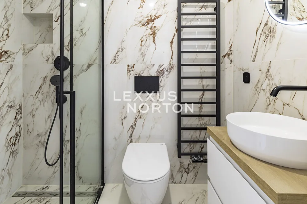 V celém domě je použita kvalitní sanita značky GROHE, která vyniká moderním designem a dlouhou životností. Vanové baterie a sprchový set HANSGROHE dodávají koupelnám prémiový vzhled a zajišťují maximální komfort. Koupelny jsou navíc obloženy velkoformátovými obklady, které podtrhují luxusní vzhled interiéru. Vysoký standart bydlení podtrhuje kvalitní dvouvrstvá dřevěná podlaha. Pro zvýšení energetické úspornosti jsou instalována okna s izolačními trojskly, která zajišťují vynikající tepelnou a zvukovou izolaci.