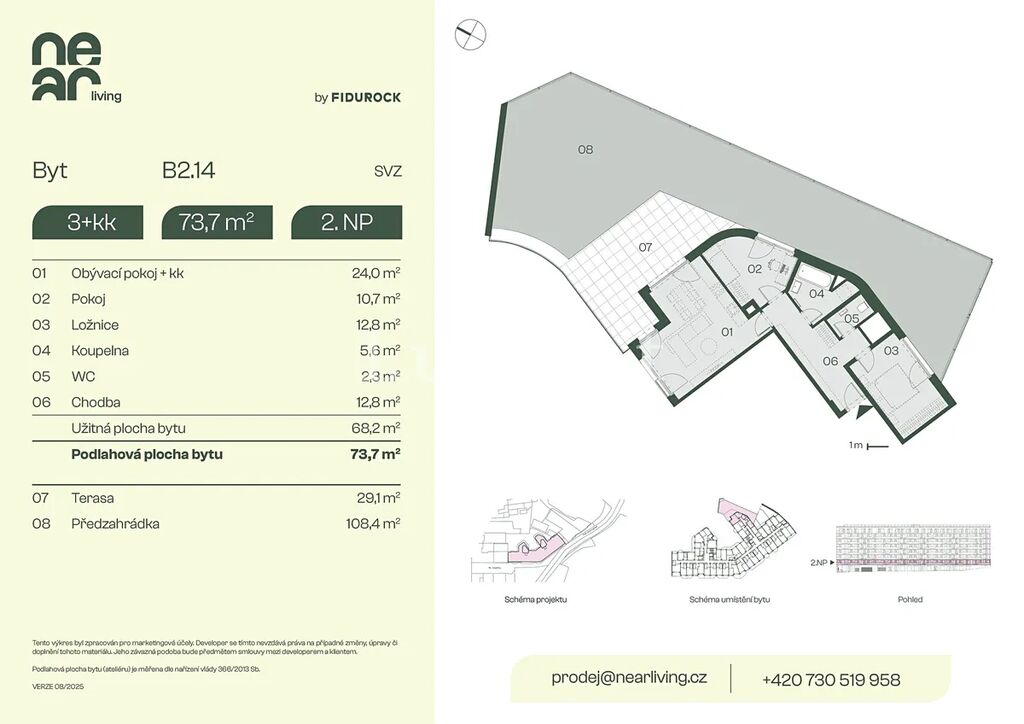 Nabízíme k prodeji byt 3+kk o podlahové ploše 73,7 m² s terasou 29,1 m² a předzahrádkou 108,4 m² v developerském projektu NEAR living v Praze 8, vznikajícím na pomezí Palmovky a Karlína.