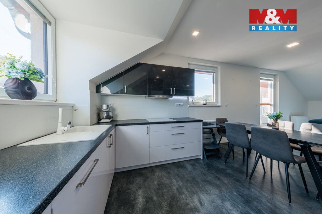 Hledáte moderní a prostorné bydlení, kde se budete cítit opravdu doma? Nabízíme Vám krásný byt o dispozici 3+kk s užitnou plochou 118,9 m², který se nachází v novostavbě rodinného domu v klidné a vyhledávané lokalitě města Chodov u K. Varů. Dům má pouze tři bytové jednotky, což zaručuje dostatek soukromí a klidné prostředí. Byt Vás přivítá prostornou chodbou, odkud se vstupuje do všech místností. Srdcem celého domova je velký obývací pokoj s kuchyňským koutem, kde je instalována moderní kuchyňská linka včetně spotřebičů. Praktickým doplňkem je technická místnost pro kotel, pračku i sušičku. K dispozici je také šatna na chodbě. Koupelna je vybavena sprchou, toaletou, umyvadlem a podlahovým vytápěním. Ložnice i dětský pokoj jsou dostatečně velké, takže si je můžete zařídit přesně podle svých představ. Z chodby se navíc dostanete na půdu, která je ideální pro uskladnění sezónních věcí. Dominantou bytu je dlouhá lodžie, která nabízí příjemné posezení. S financováním Vám rádi pomůžeme.