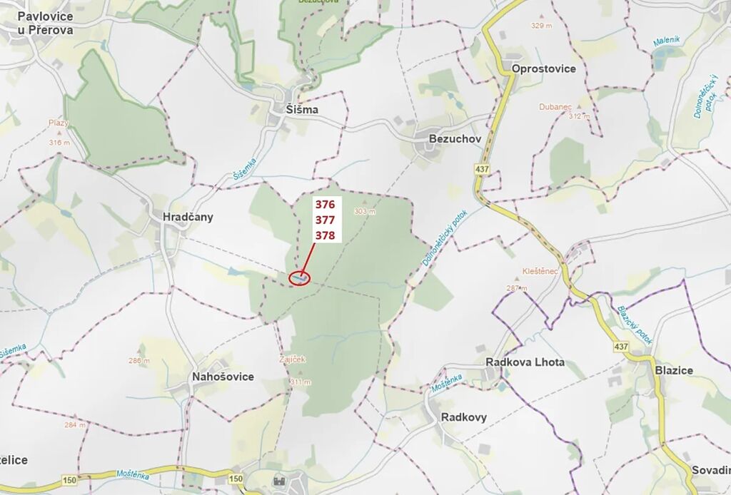 Lesní pozemky o výměře 1703 m2, parcelní čísla 376, 377, 378, podíl 1/1, katastrální území Hradčany na Moravě, obec Hradčany, obec s rozšířenou působností Přerov, okres Přerov, Olomoucký kraj. Po těžbě.