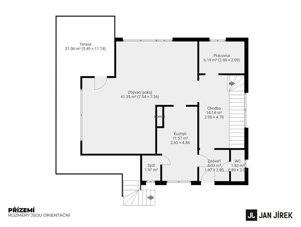 V přízemí se nachází prostorný obývací pokoj s jídelnou, kuchyň, spíž, samostatná toaleta a pracovna. Světlá výška místností je 2,55 m.
