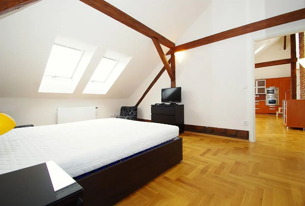 Dispozice bytu zahrnuje vstupní chodbu s vestavnou šatní skříní, světlý obývací pokoj s plně vybaveným kuchyňským koutem značky Sýkora, ložnici s manželskou postelí a úložným nábytkem, koupelnu se sanitou Villeroy & Boch, samostatnou šatnu a pracovnu na galerii s přístupem na střešní terasu orientovanou do klidného vnitrobloku.