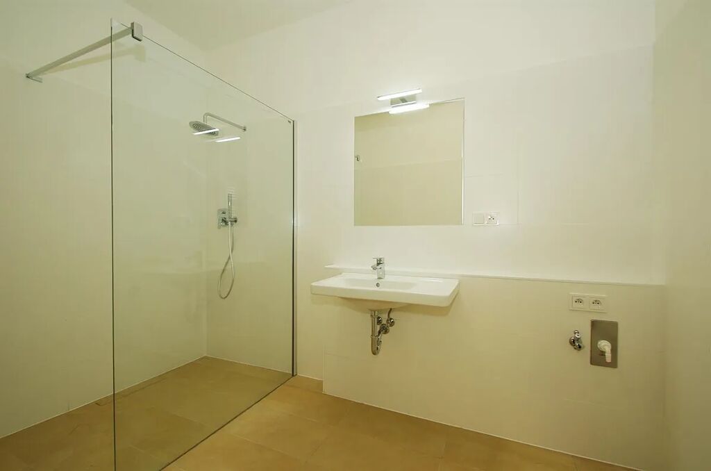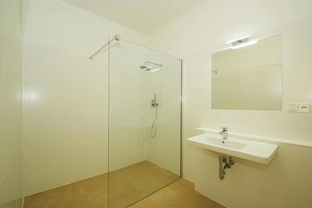 Interiér bytu je nezařízený a dispozice nabízí vstupní předsíň, obývací pokoj s vybaveným kuchyňským koutem, ložnici, koupelnu se sprchovým koutem a oddělenou toaletou. Pokoje jsou prostorné a světlé. Kuchyňský kout je vybaven vestavěnými spotřebiči (varná deska, elektrická trouba, myčka, lednice s mrazákem). K bytu náleží sklep.