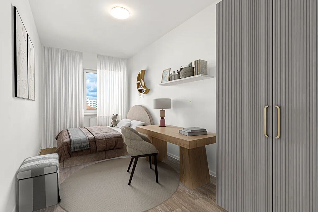Srdcem bytu je prostorný obývací pokoj s kuchyňským koutem, který se otevírá na terasu o rozloze 20 m², orientovanou na jihovýchod. Díky této orientaci je obytný prostor příjemně prosvětlený od ranních hodin a terasa se stává ideálním místem pro snídani na čerstvém vzduchu, hry s dětmi či večerní posezení. Ložnice a druhý pokoj, orientované na severovýchod, poskytují klidné zázemí pro odpočinek i soustředěnou práci.