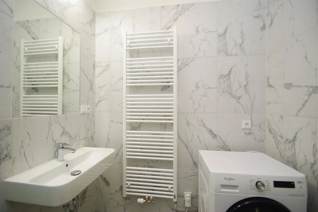 Interiér bytu je nezařízený, ale existuje možnost pronájmu zařízeného interiéru za zvýšené nájemné, a dispozičně nabízí vstupní prostor (4,25 m2), prostorný obývací pokoj (21,96 m2) s kuchyňským koutem vybaveným vestavěnými spotřebiči (elektrická varná deska, mikrovlnná trouba, digestoř), samostatnou ložnici (8,96 m2), a stylovou koupelnu (3,93 m2) s umyvadlem, sprchovým koutem, toaletou a pračkou.