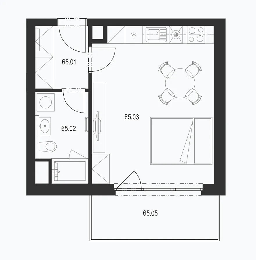 Byt B25 s dispozicí 1+kk o podlahové ploše 34,74 m² je prakticky uspořádaný. Dispozičně se člení na vstupní chodbu, koupelnu se sprchovým koutem, WC, umyvadlem a prostorem pro umístění pračky a hlavní obytnou místnost s kuchyňským koutem a vstupem na balkón.