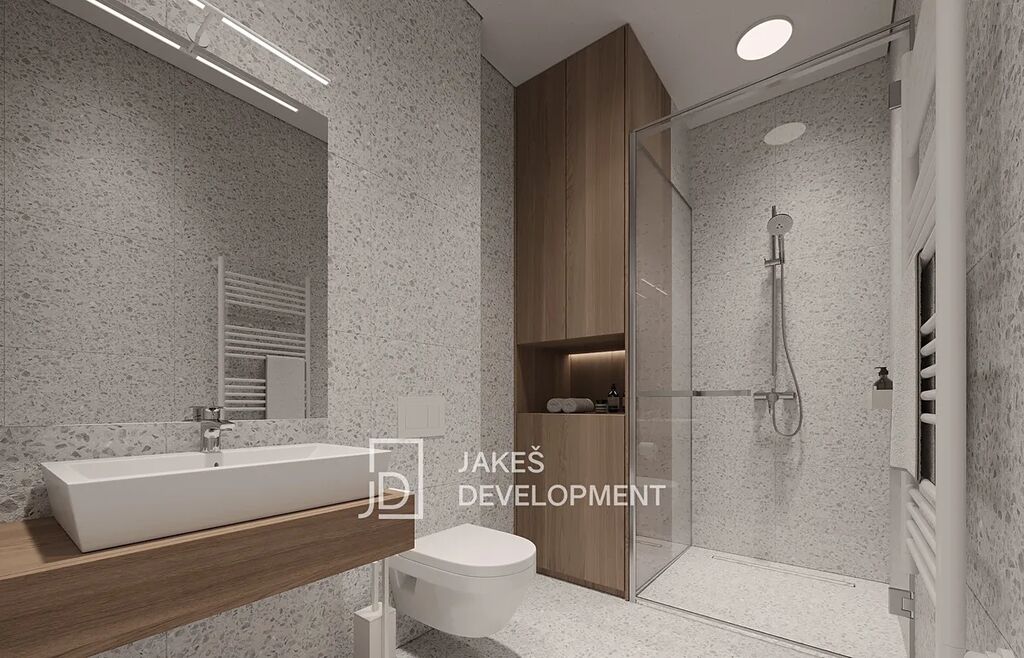 Vytápění je zajištěno radiátory ve všech obytných místnostech i koupelně. Byt bude dokončen s kvalitními vinylovými podlahami, elegantní koupelnou s keramickým obkladem a moderními interiérovými dveřmi. Byt disponuje kuchyňskou linkou s vestavěnými spotřebiči, osvětlení a garnýže. Po dohodě je také možnost pronajmout parkovací stání za 2000,-Kč / měsíčně. K pohodlí obyvatel domu přispívá také společné venkovní posezení ideální pro odpočinek, a praktický uzamykatelný box na kola s kapacitou až 10 kol.