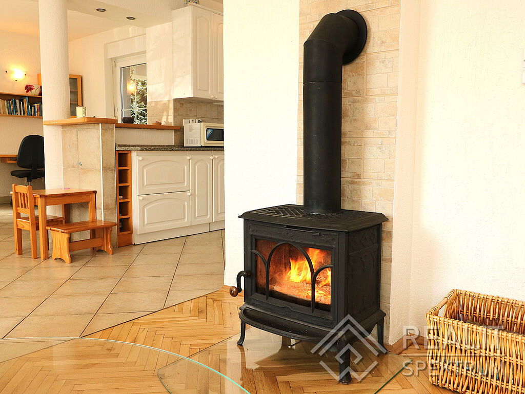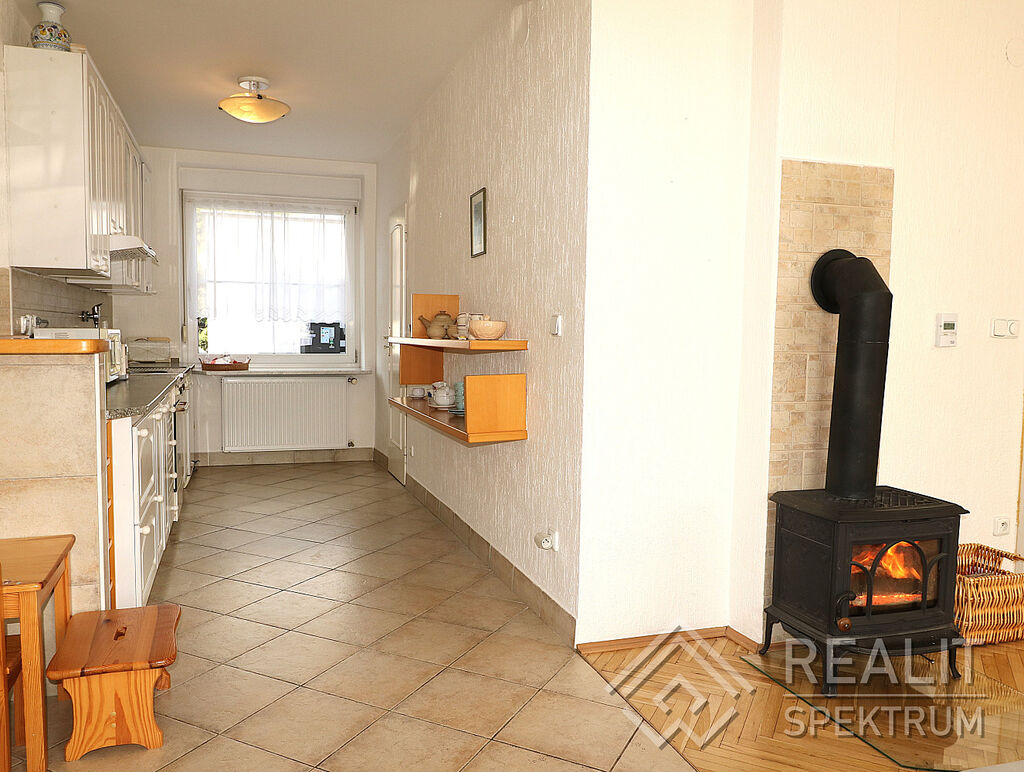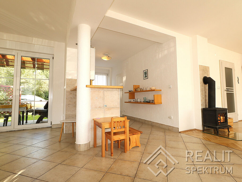 • PROSTOR PROSVĚTLENÝ SLUNCEM: V 1. NP Vás čeká vzdušný, světlem prosycený obývací prostor s kuchyní, jídelnou a krbovým lokálním topidlem pro dokreslení atmosféry a pohody. Nechybí šatna a WC.