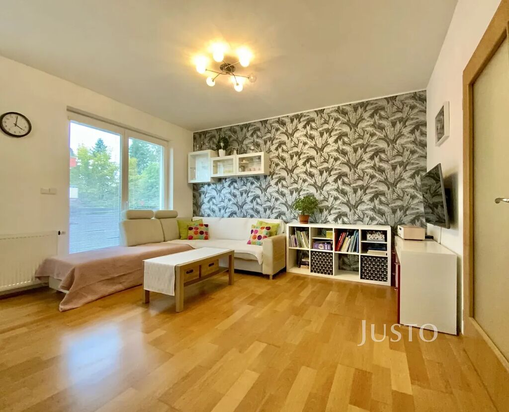 Dispozice zahrnuje obývací pokoj s kuchyňským koutem a jídelnou, dvě samostatné ložnice, koupelnu s vanou i sprchovým koutem, samostatné WC, komoru a prostornou vstupní chodbu. V koupelně je podlahové vytápění. Byt má velká francouzská okna s jižní orientací, která umožňují vstup na balkon ze všech pokojů. Velký balkon nabízí příjemné posezení třeba u kávy i prostor pro dětské hry. K dispozici je kočárkárna/kolárna.