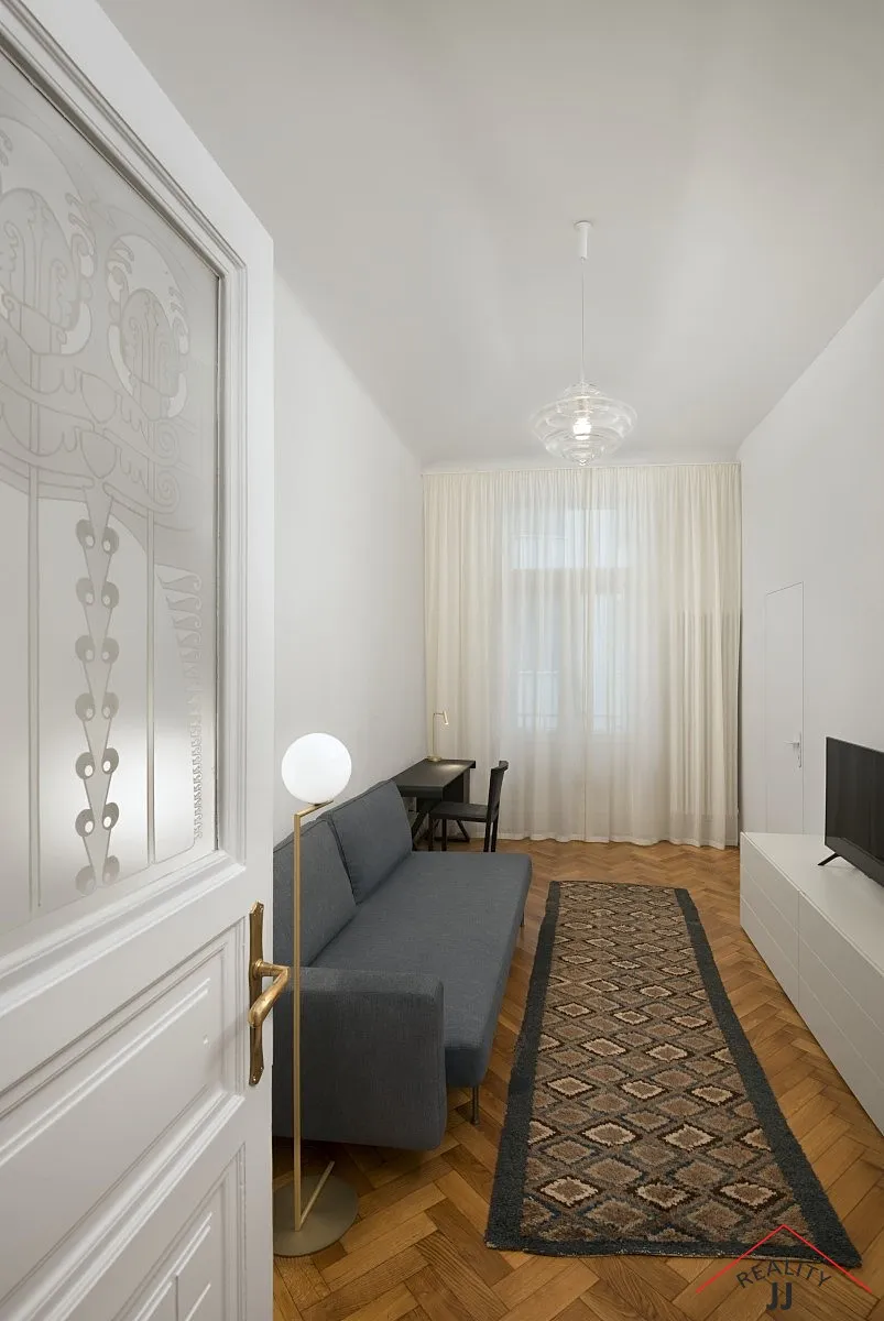Byt se nachází ve druhém patře secesního domu s výtahem. K dispozici je vstupní hala, ze které se vchází do denní části bytu sestávající ze dvou světlých vzájemně propojených místností s půvabným arkýřem a malým balkonem a výhledem do Pařížské ulice. Interiér je vybaven sedací soupravou doplněnou několika soliterními kusy nábytku a velkoplošnou TV, kulatým jídelním stolem pro 6 osob a vkusně začleněným kuchyňským koutem.
