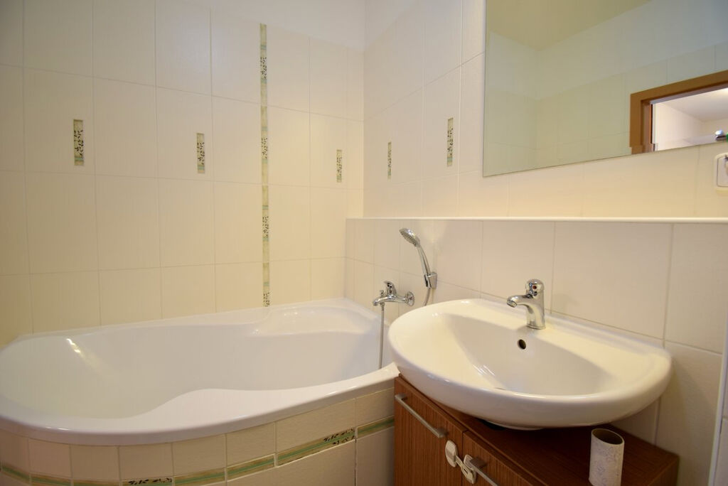 Byt se nabízí částečně vybavený. Kuchyňská linka disponuje troubou, elektrickou varnou deskou, digestoří a rychlovarnou konvicí. Koupelna je spojená s toaletou a nachází se zde vana, zrcadlo s umyvadlem a pračka.