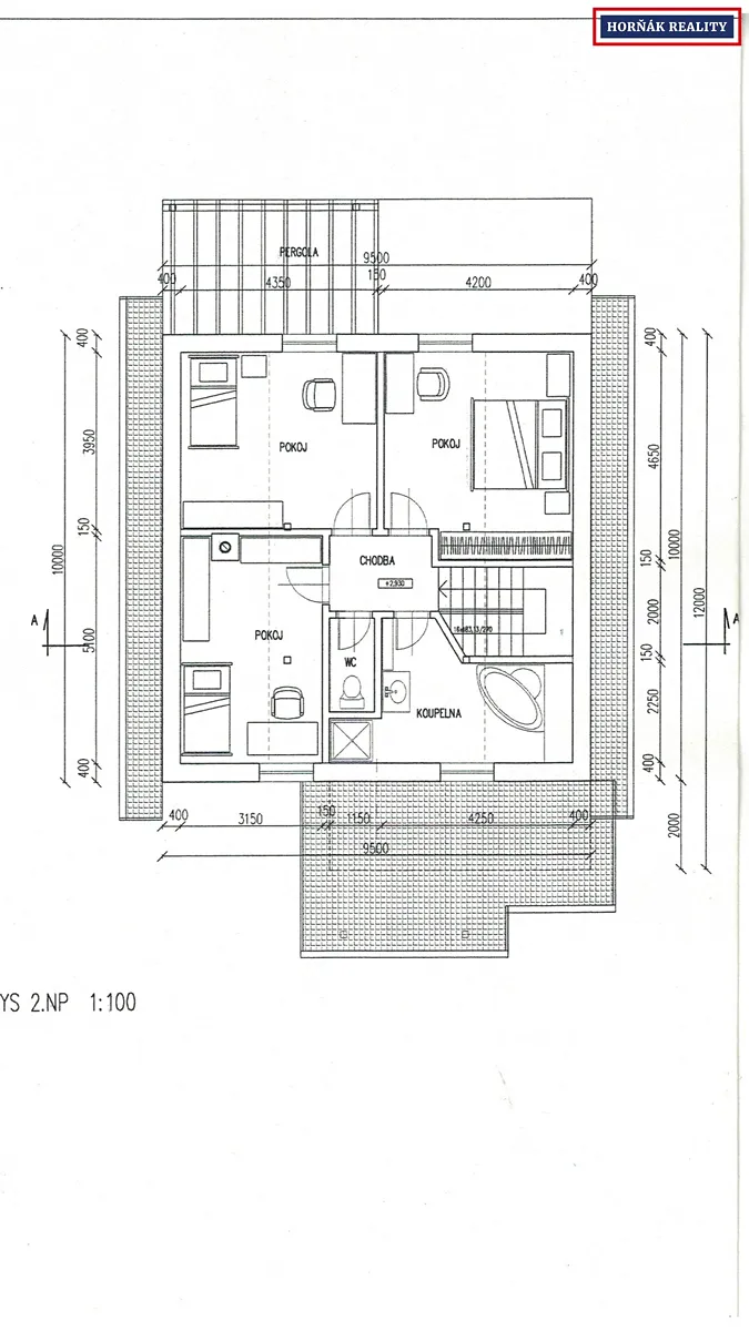 V podkroví o rozloze 95m2 je vše připraveno na 3 samostatné pokoje, koupelnu a samostatné WC.