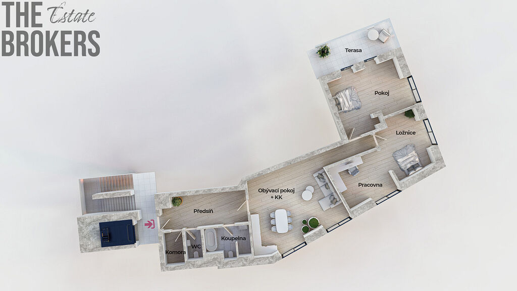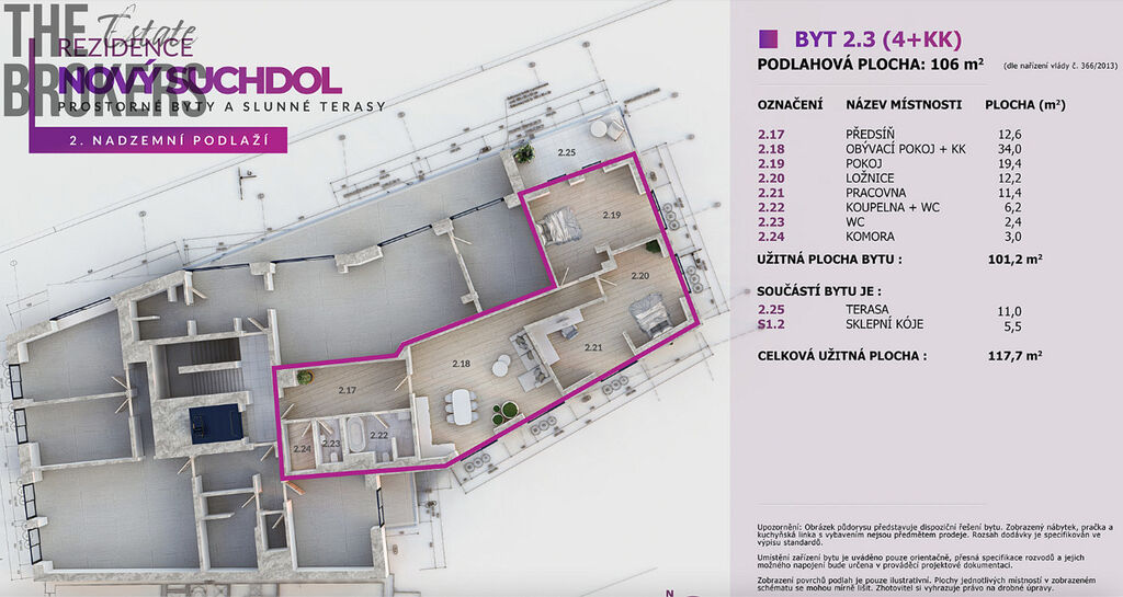 Tento prostorný byt 4+kk o celkové rozloze (117,7 m²) se nachází v prvním patře rezidenčního komplexu. Nabízí prostorný obývací pokoj s kuchyňským koutem, tři pokoje , koupelnu s toaletou, samostatnou toaletu a komoru ( 101,2m²). Z jedné ložnice je vstup na terasu ( 11m²). Součástí bytu je sklepní kóje ( 5,5m²). K jednotce lze dokoupit parkovací stání . Ideální pro rodinné bydlení.
