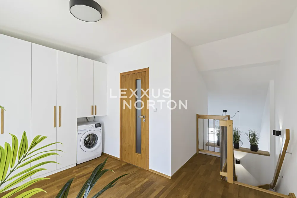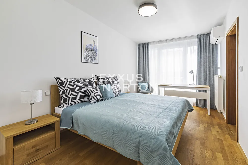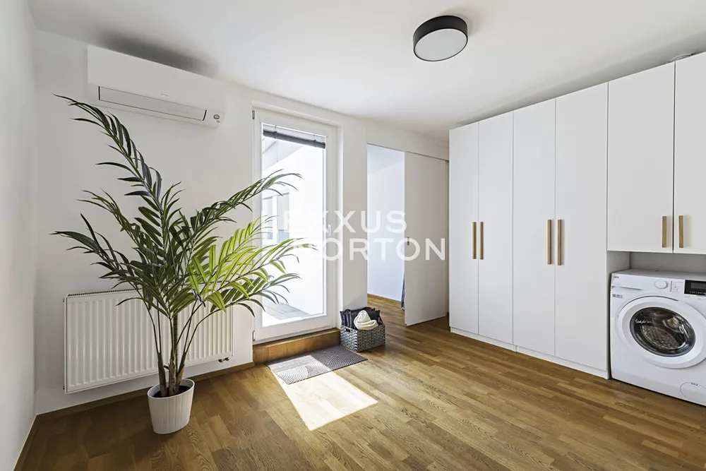 Tento byt k pronájmu nabízí k užívání vstupní chodbu, prostorný obývací pokoj s plně vybaveným kuchyňským koutem (sklokeramická deska, trouba, lednice, mrazák, mikrovlnná trouba a myčka nádobí), ložnici, koupelnu (sprchový kout), samostatnou toaletu a šatnu. Po schodech nahoru se dostanete do patra, které nabízí další ložnici, koupelnu (vana, toaleta a bidet) a komoru. K bytu náleží terasa (28 m2). Byt je navíc vybaven pračkou, klimatizací, předokenními roletami a vestavěnými skříněmi.