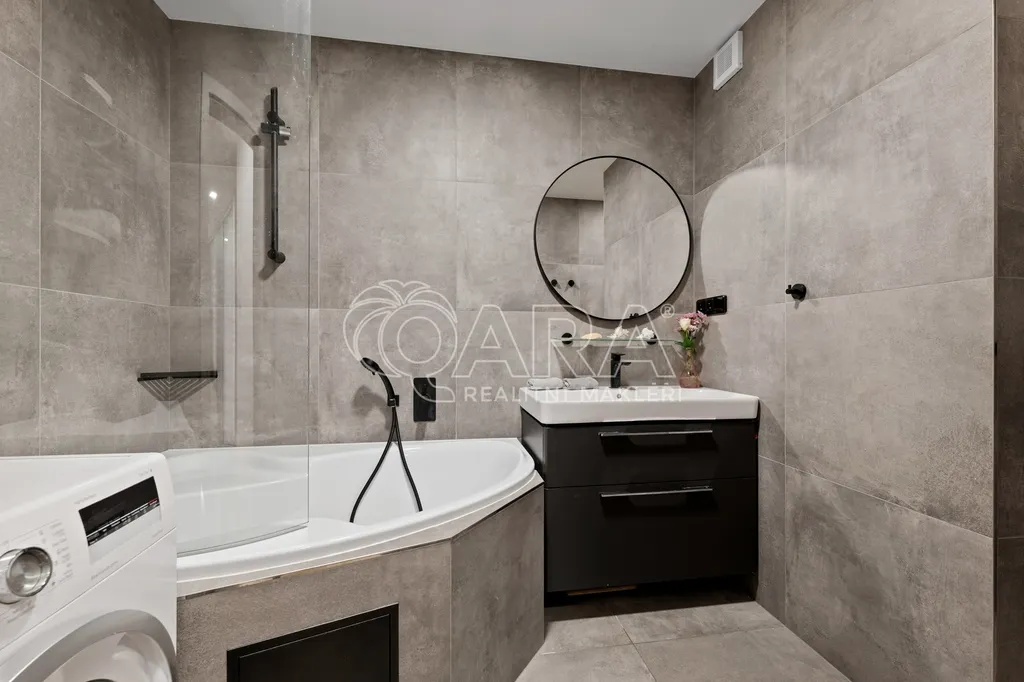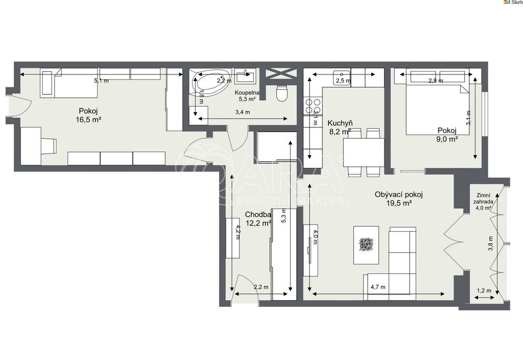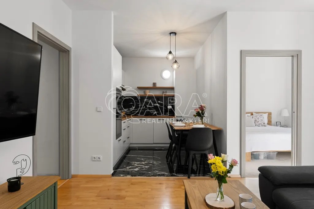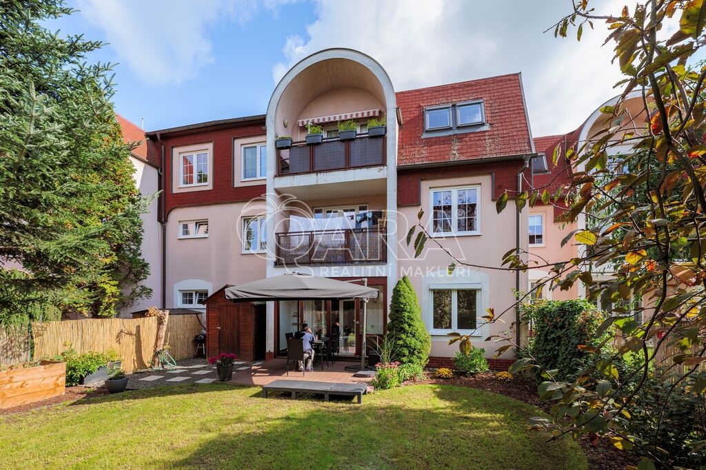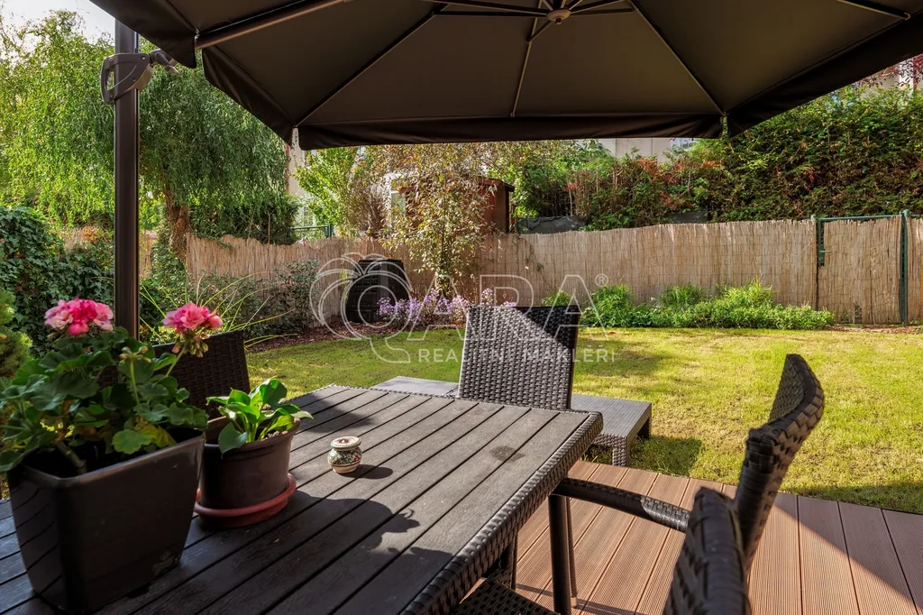 Dominantou bytu je obývací pokoj s kuchyňským koutem, ze kterého se přes zimní zahradu dostanete na západně orientovanou předzahrádku o velikosti 106 m². Ta nabízí příjemné posezení, dostatek soukromí a možnost trávit čas venku prakticky od jara do podzimu.