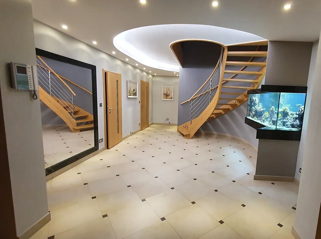Garáž, kovové schodiště, pracovna, sklad, kotelna–tepelné čerpadlo, prádelna, předsíň, šatna, WC, dřevěné schodiště, hala, akvárium1400l., krb, sklad kuchyně, kuchyň se žulovými pracovními deskami (kuchyňska linka, el.varná deska indukce De Dietrich, digestoř, el. trouba De Dietrich, mikrovlnná trouba De Dietrich, parní trouba De Dietrich, dva dřezy, americká lednice), obývací pokoj s jídelnou se světelnémi rampy se stmivání světla, terasa, žulové schodiště, tělocvična, chodba, bazén ((s prosklenou stěnou do bowlingu) 60 m2 (90 m3), hloubka 1,50m, protiproud, skákadlo, chrlič, masážní proud, vzduchotechnika, automatické dávkování chemie, UV lampa), sprcha,