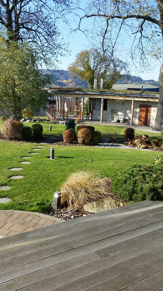 parapety žulové, dveře mahagonové, venkovní terasy z trvanlivého tvrdého dřeva bangkirai, krbová kamna, krb.