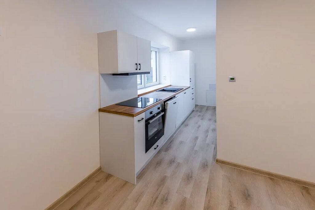 V bytě najdete designovou kuchyňskou linkou s keramickým dřezem, varnou deskou, troubou, vestavěnou lednicí s mrazákem, digestoří i myčkou.