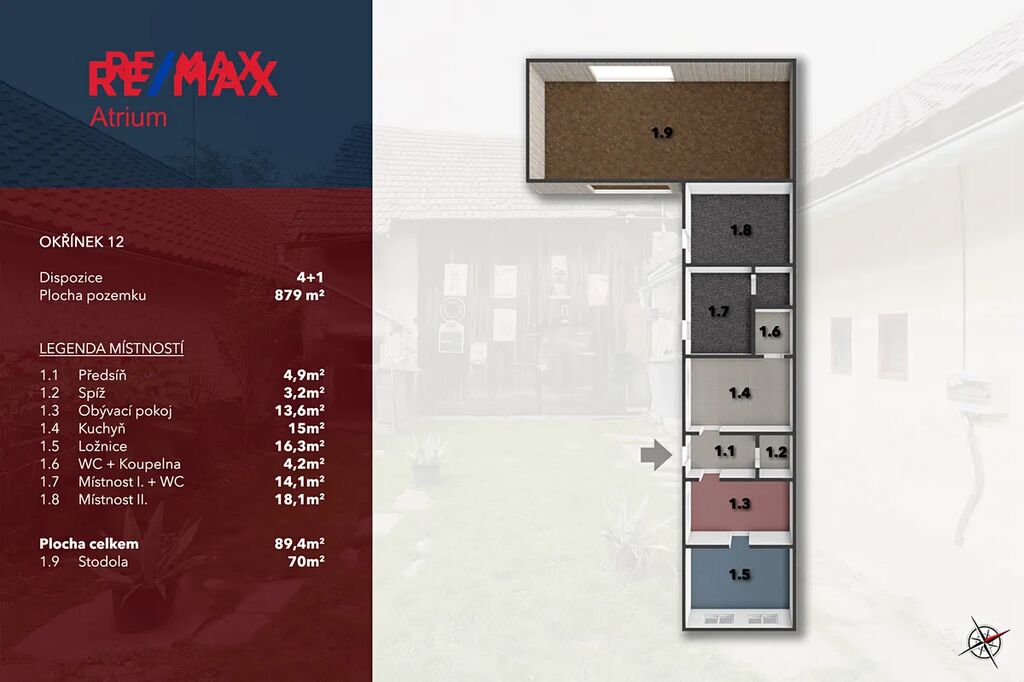 Pozemek, na kterém dům stojí, má celkovou rozlohu 879 m², a za domem se rozkládá velká louka a pole. Kapitolou samou pro sebe je stodola, která i po letech stále plní svou funkci – je ale pouze na vás, na co ji proměníte.