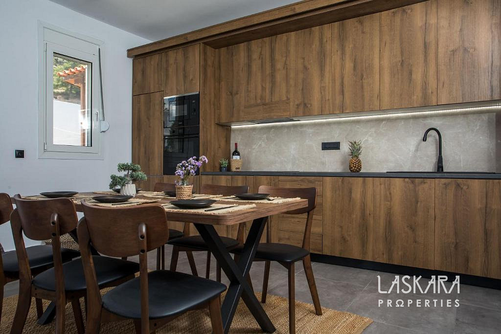 V přízemí se rozprostírá vzdušný obývací prostor s kuchyní, která spojuje eleganci s funkčností. Z každého rohu je výhled na moře a olivové háje.