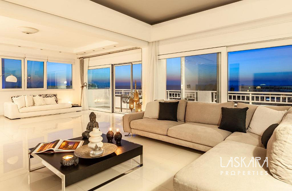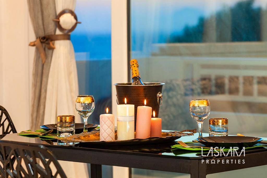 Panoramatická okna rámují dechberoucí pohled na Egejské moře a každý západ slunce proměňují v živý obraz. Elegantní, otevřený interiér je zalitý přirozeným světlem a působí uklidňujícím dojmem sofistikovaného komfortu.