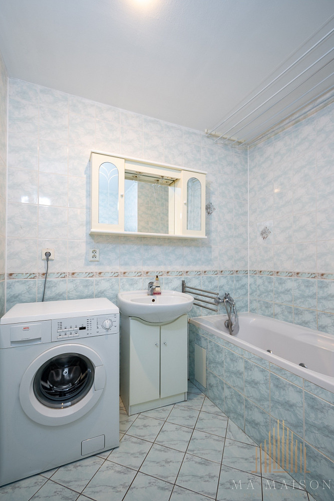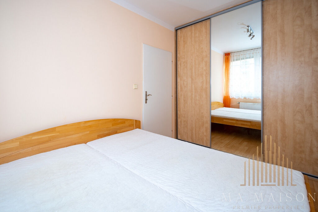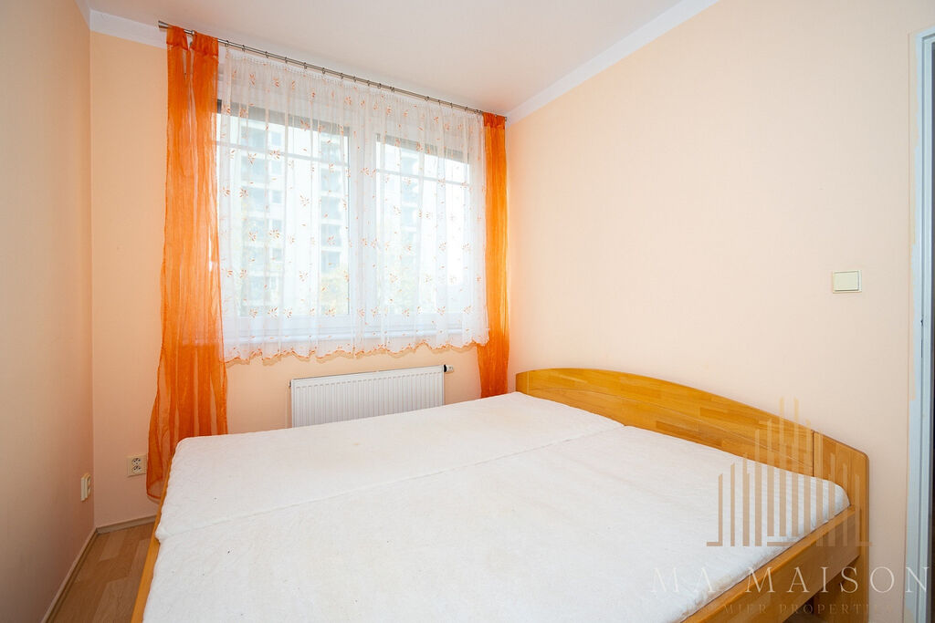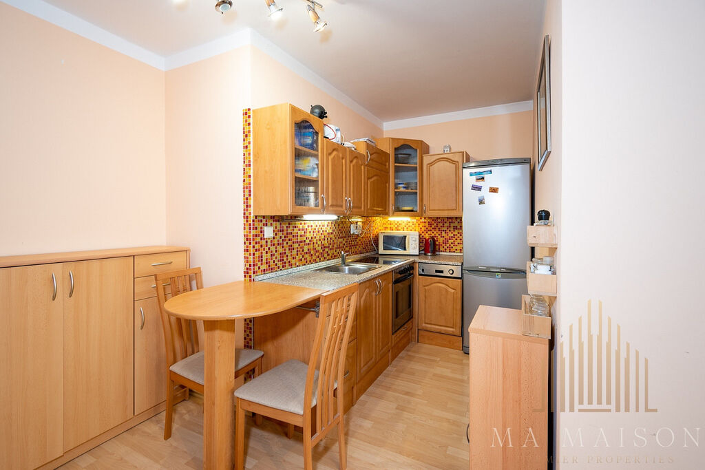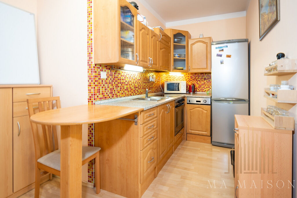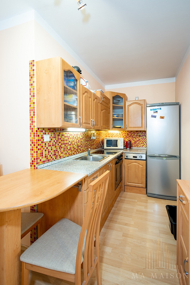 Byt se nachází v 3. nadzemním podlaží budovy s výtahem. Byt je kompletně zařízen a sestává ze vstupní předsíně, koupelny s vanou a toaletou, obývací části a ložnice. Součástí obývací místnosti je kuchyňská linka s barovým stolem, ke kterému patří dvě jídelní židle. Kuchyňská linka je vybavená lednicí s mrazákem, varnou deskou, troubou, digestoří, myčkou a mikrovlnnou troubou. V obývací části se nachází gauč s dvěmi křesílky a konferenčním stolkem. Součástí vybavení je také TV a TV stolek, poličky a skříňky. Taktéž se zde nachází pracovní stůl s dvěmi židlemi. Ložnice je vybavená manželskou postelí vč. matrací a prostornou šatní skříní. Koupelna s vanou, toaletou a pračkou. V předsíni se dále nachází další prostorná šatní skříň, která nabízí spoustu úložného prostoru. Dále pak botník a věšák.