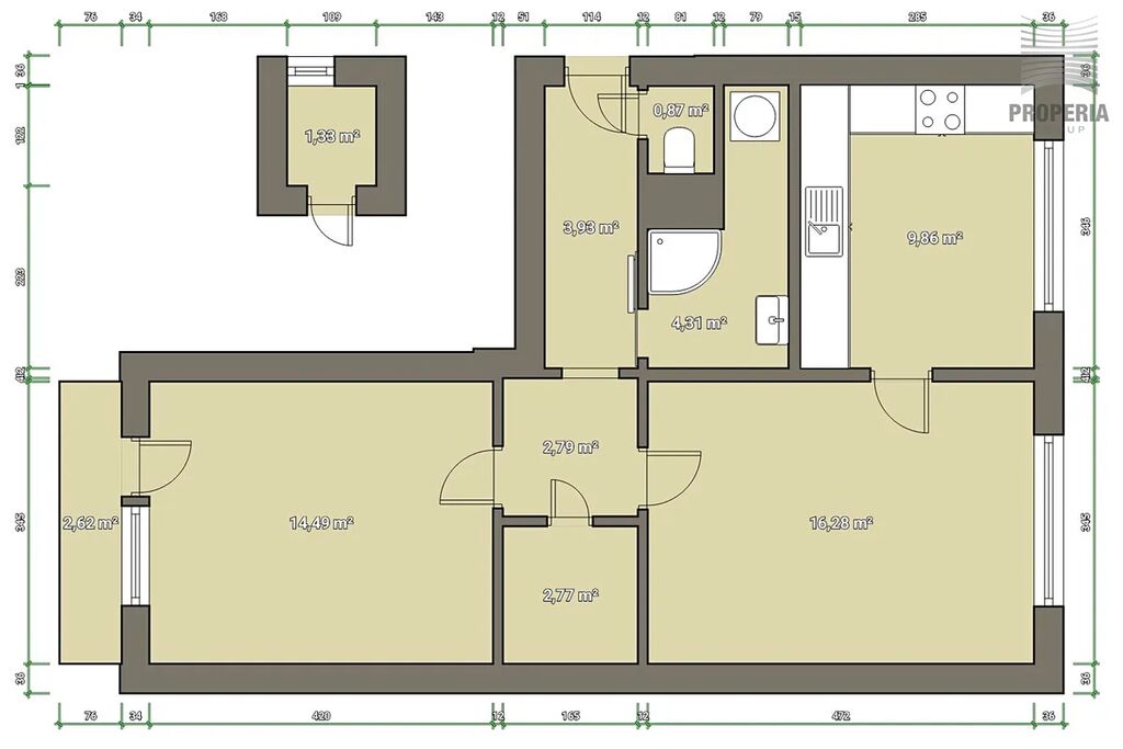 Byt je situován ve 2. patře/4 a jeho celková plocha činí příjemných 59,23 m2 (z toho lodžie 2,6 m2 a komora pro uskladnění sezónních věcí v mezipatře 1,33 m2).