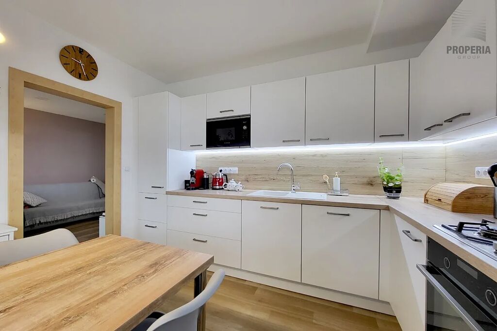 Byt prošel rozsáhlou a pečlivou rekonstrukcí, jejíž součástí byla mírná změna dispozice, vyzdění bytového jádra, instalace nových rozvodů elektřiny, položení moderních podlah, montáž policového systému regálů v šatně a zhotovení kuchyňské linky na míru.