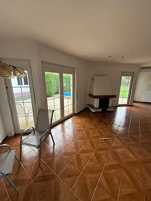 Velice prostorný prosklený slunný obývací pokoj přes 60m2 s kuchyň.linkou s veškerými vest.spotřebiči, s ostrůvkem, s krbovou vložkou na tuhá paliva, s několika vstupy přes francouzké okno na terasu téměř 40m2 s přímým vstupem do bazénu.