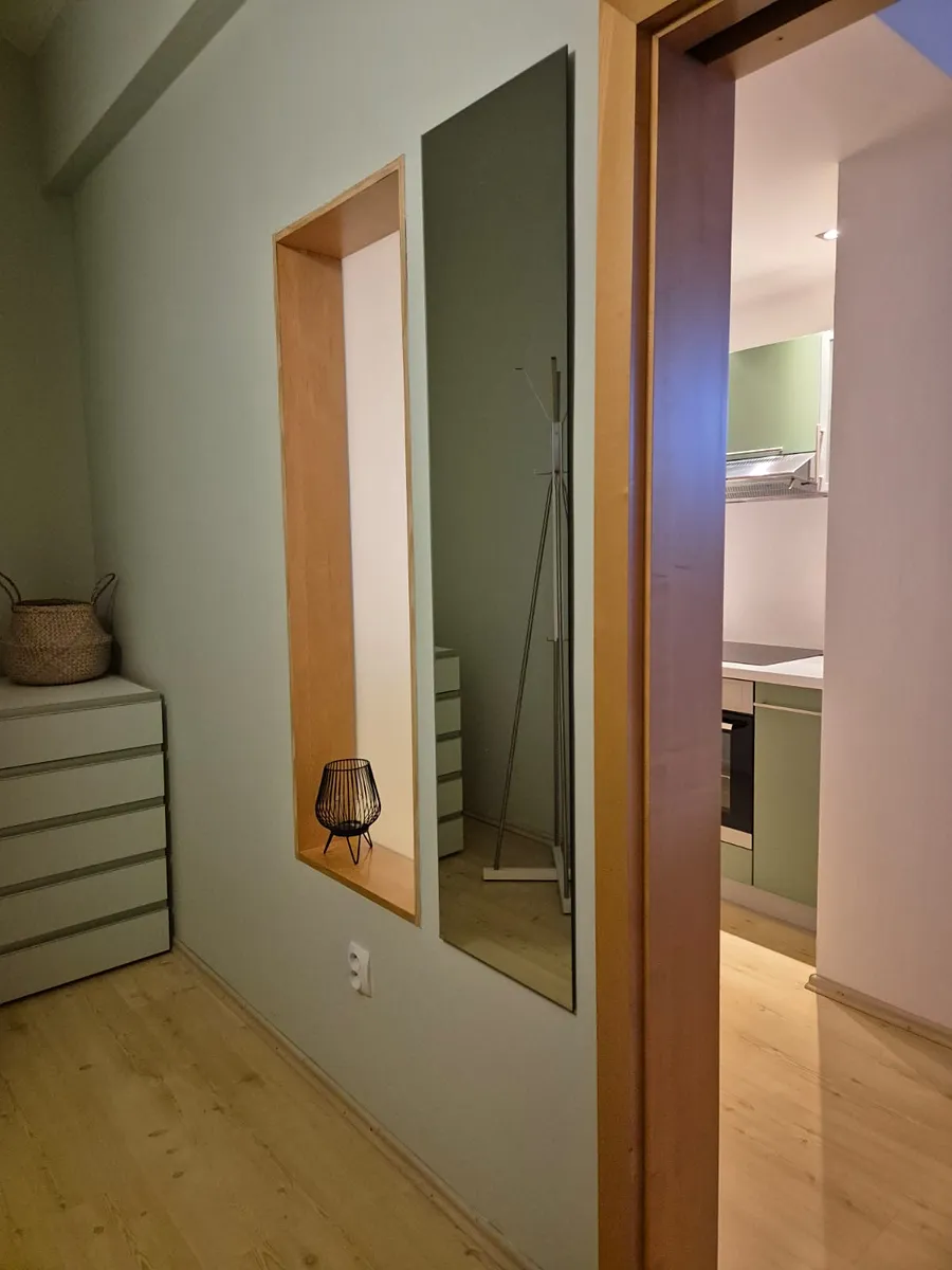 Vstupní chodbou se zázemím úložného prostoru a věšákovou stěnou projdeme do obytné části. Prostor je řešen podle příjemně působícího architektonického návrhu, obývací pokoj je prosvětlen velkými okny s výstupem na terasu a s kouzelným výhledem do klidného vnitrobloku se stromy a keři. Jídelní kout je doplněn oknem s přirozeným denním světlem.