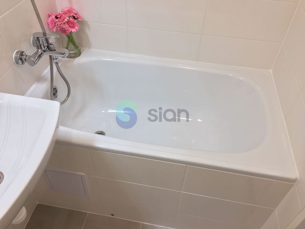 V koupelně se nachází vana a umyvadlo, toaleta je oddělena přepážkou.