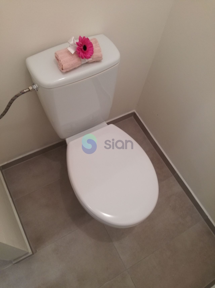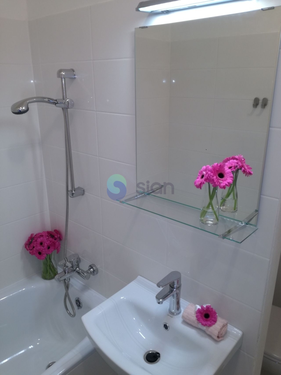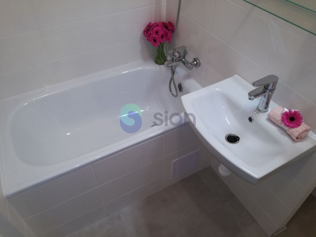Koupelna je vybavena vanou a umyvadlem, toaleta je součástí koupelny a oddělená přepážkou.