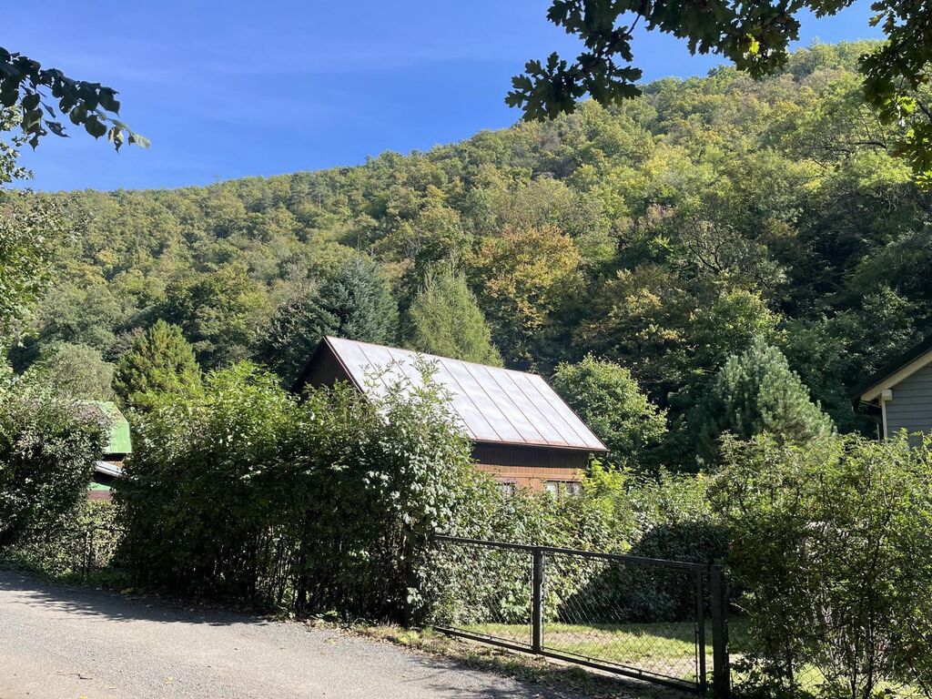 Chata s podezdívkou, dřevěná a podkroví, střecha sedlová krytina plech.