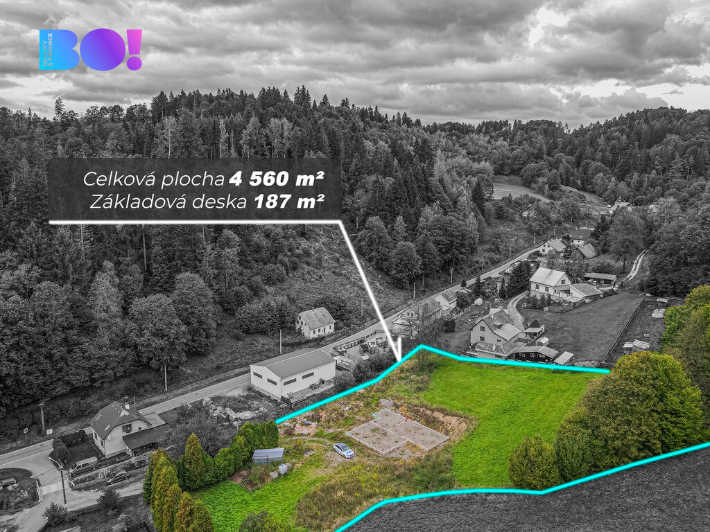 Nabízíme exkluzivní stavební pozemek o velikosti 4 560 m² s rozpracovaným základem a projektem pro dům v srdci Jeseníků.