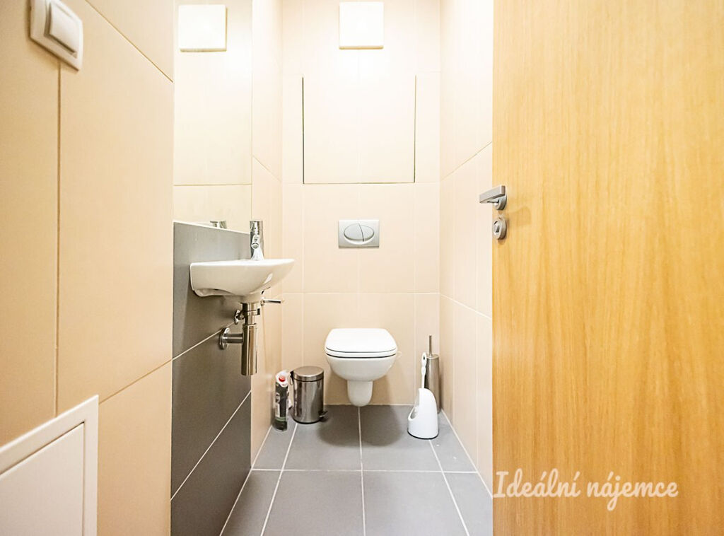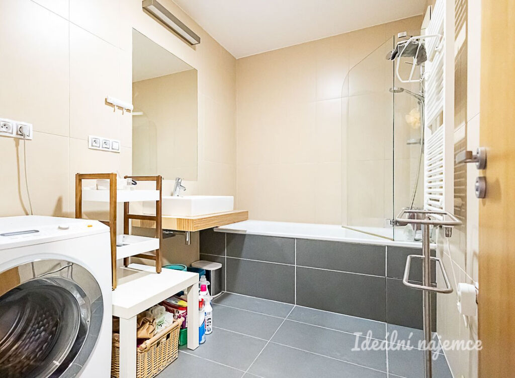 Koupelna je vybavena vanou, umyvadlem a pračkou, toaleta je samostatná.