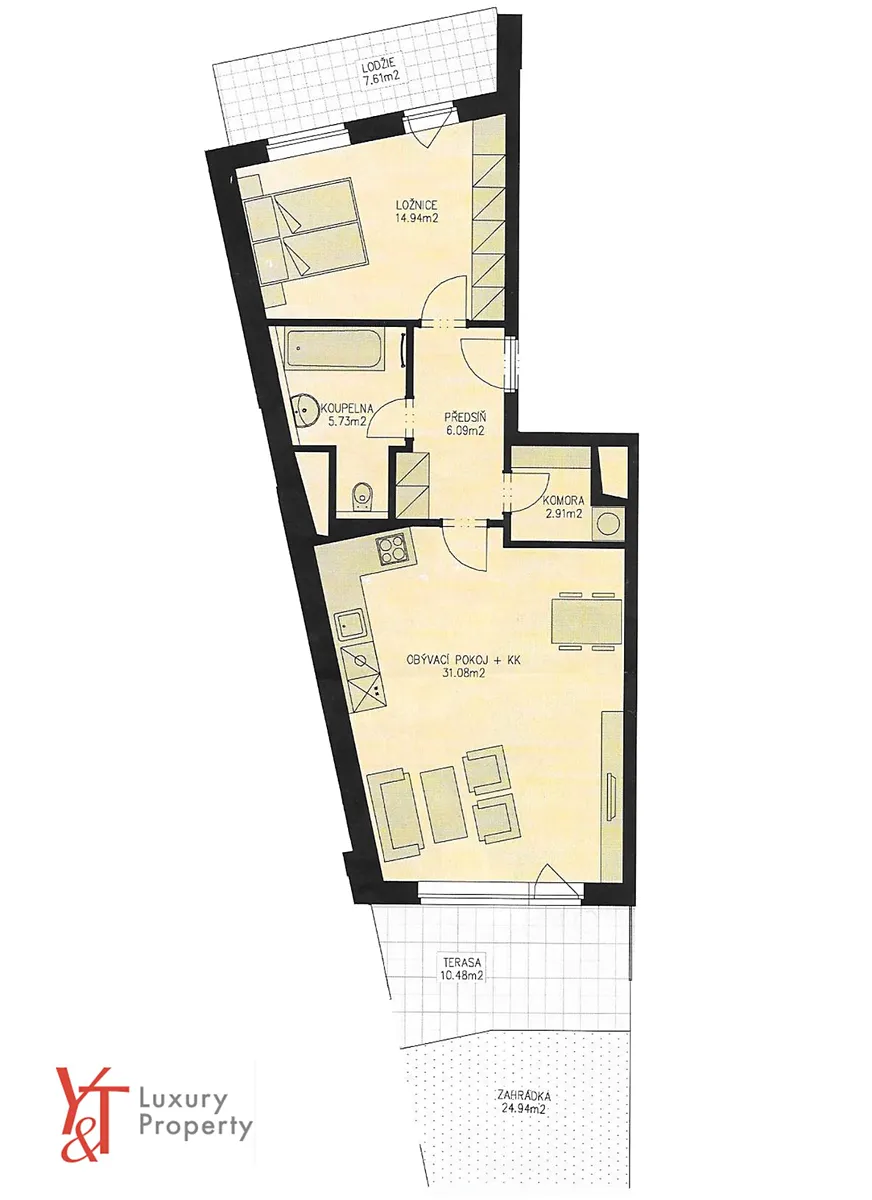 Dispoziční řešení je navrženo s důrazem na pohodlí a praktičnost. Ložnice o velikosti 15 m² disponuje přímým vstupem na balkon. Prostorný obývací pokoj s kuchyňským koutem (31 m²) je orientován do vnitrobloku a umožňuje vstup na terasu a předzahrádku, která se stane vaším soukromým útočištěm. Kuchyňská linka je vybavena barovým pultem a místem k sezení. Součástí bytu je koupelna s vanou a toaletou a také samostatná technická místnost s dostatkem prostoru pro pračku a sušičku.