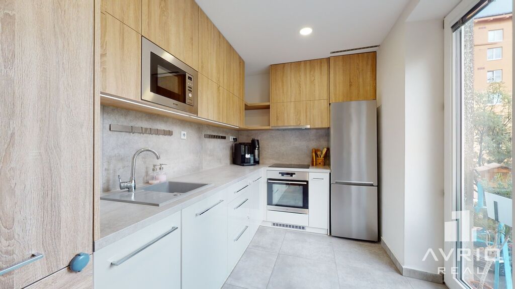 V kuchyni je francouzské okno, kuchyňská linka na míru v moderních barvách s imitací granitového dřezu vybavená indukční varnou deskou, mikrovlnou troubou, pečící troubou a vestavnou myčkou a lednicí.