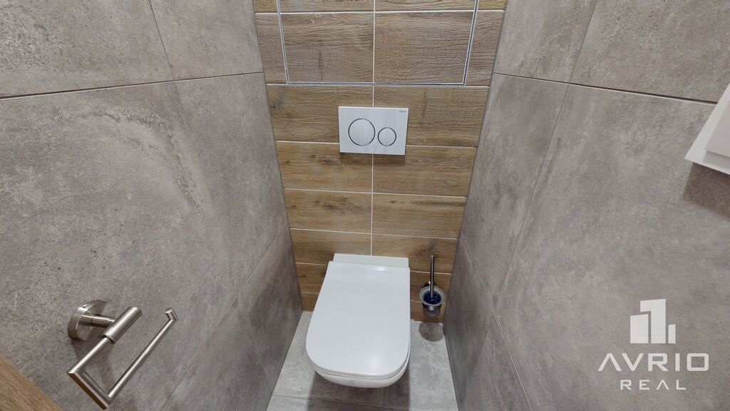 Koupelna je vybavena kvalitními obklady a bateriemi Hansa, vanou s přepadem, umyvadlem Villeroy Boch a pračkou. Samostatná toaleta se závěsným WC s úpravou RIM-OFF a pomalým sedákem.