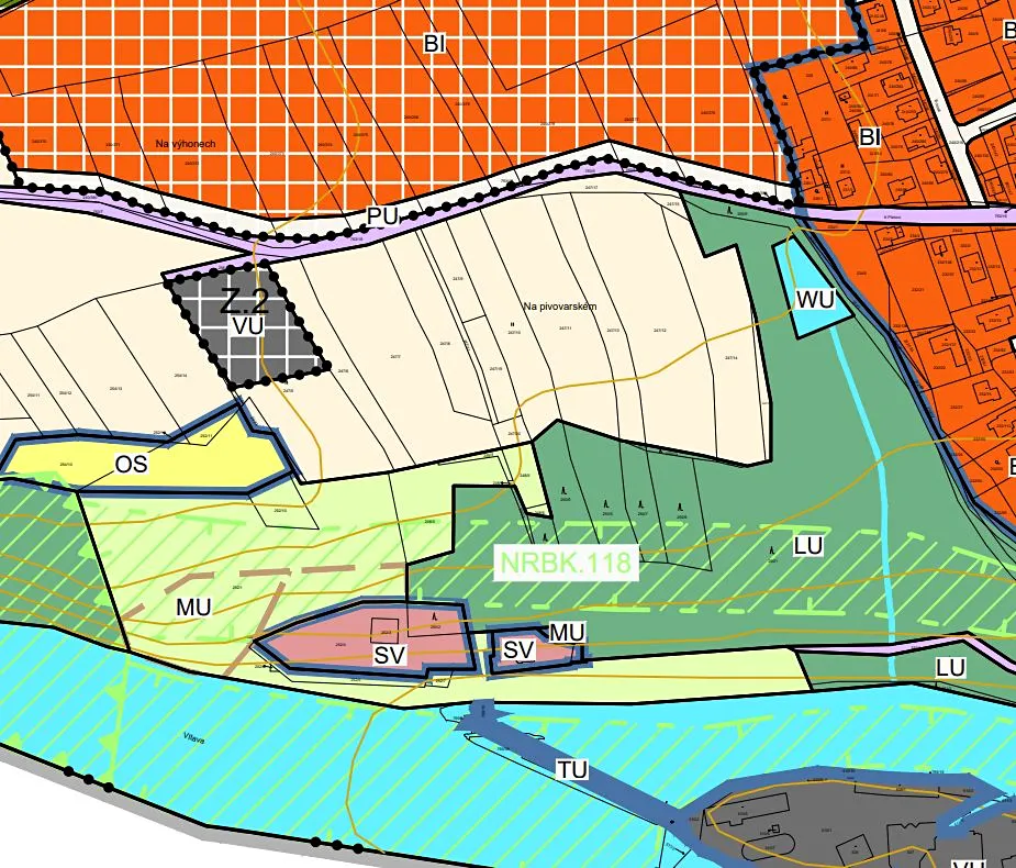 Pozemky na pravé straně příjezdové komunikace jsou v územním plánu vedené jako plocha určená pro výstavbu rodinných domů. V současnosti není změna územního plánu předmětem projednání, nelze ji tedy garantovat, ale do budoucna ji nelze vyloučit.