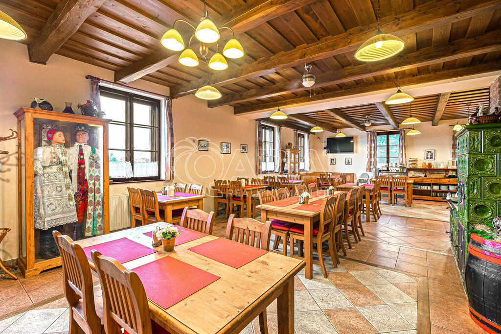 Pak je tady restaurace pro zhruba 60 osob, jejíž dominantou jsou nádherná kachlová kamna, a kterou rozšiřuje klidná, příjemná zahrádka pro dalších 40 hostů.