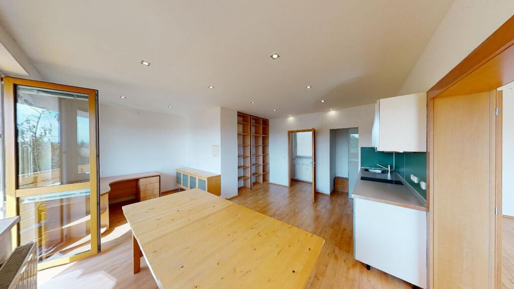 Byt je částečně vybaven, obsahuje kuchyňskou linku, stůl, vybavení pracovny, knihovnu a skříně. Nábytek je možné vyklidit, pokud by nájemníci preferovali vybavit vlastním nábytkem nebo si plánovali pořídit jiný.