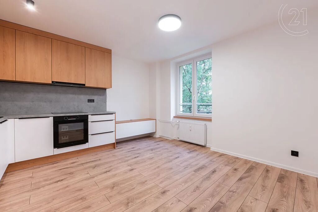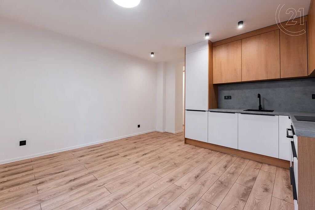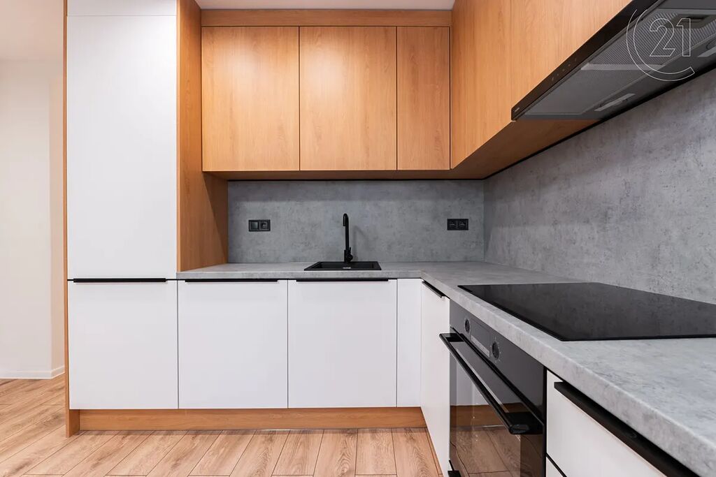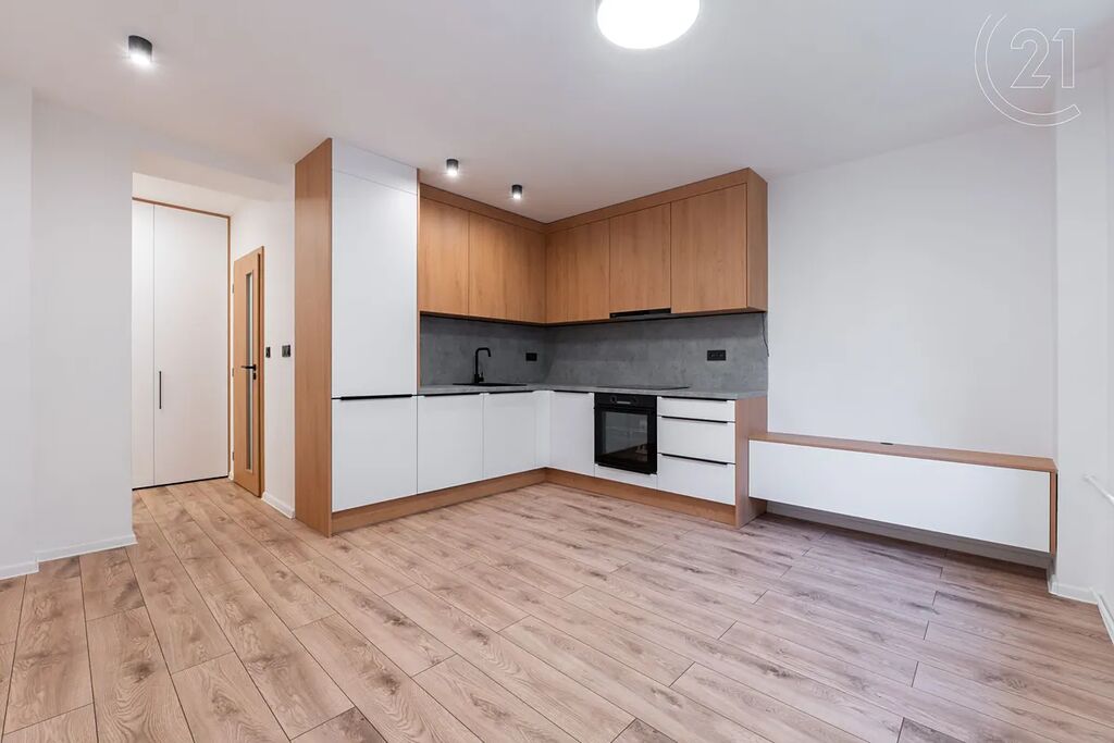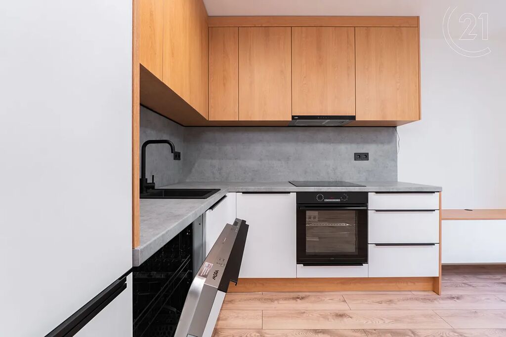 • Moderní kuchyňská linka (LED podsvícení) s vestavnými spotřebiči (myčka a elektrická trouba se sklokeramickou deskou, lednice) je propojena s obývacím pokojem (je tak vytvořen otevřený světlý obývací prostor)