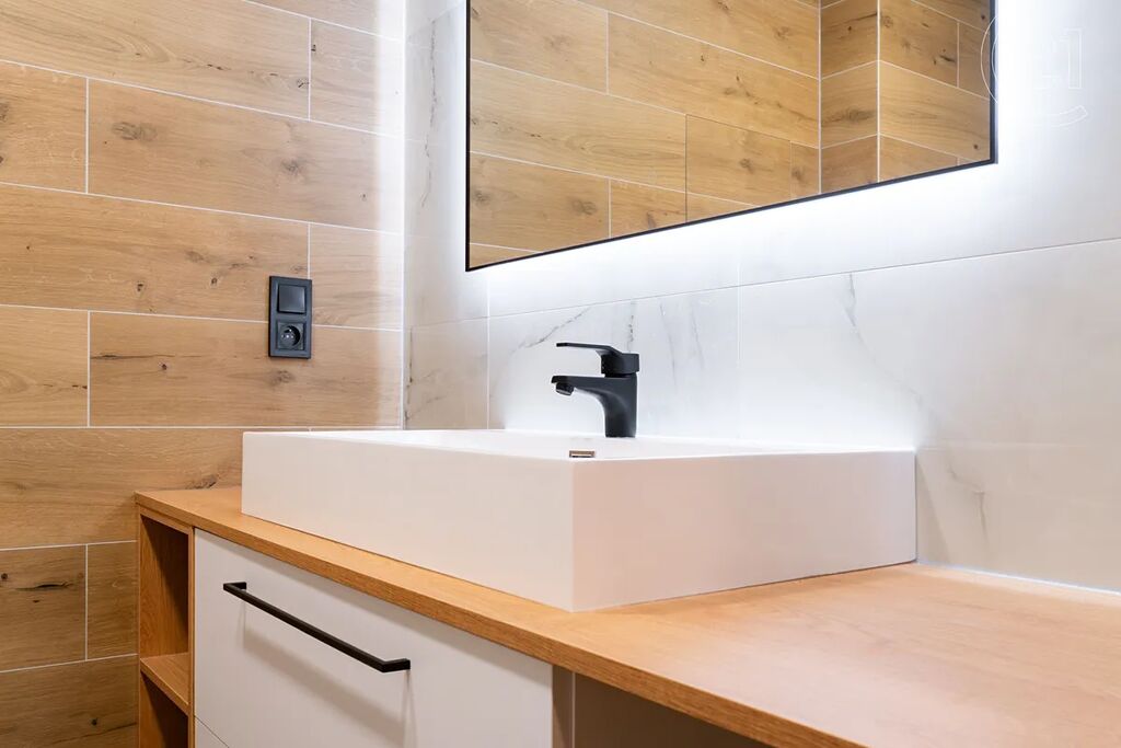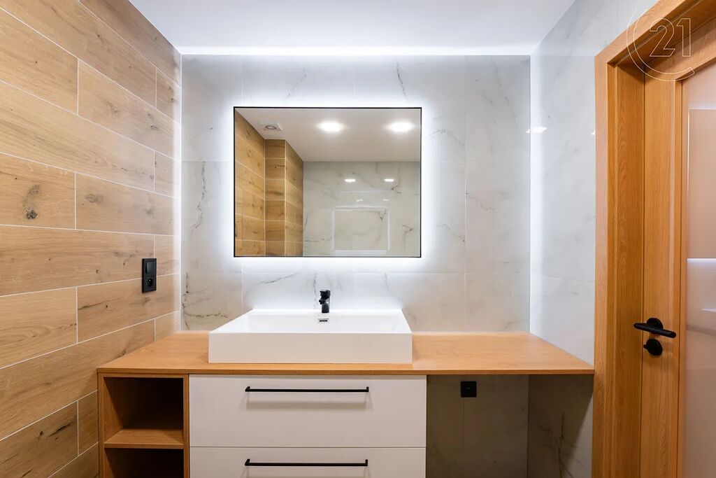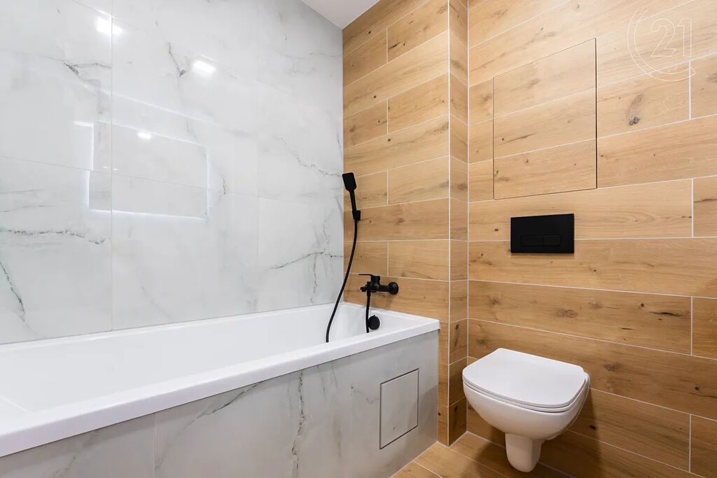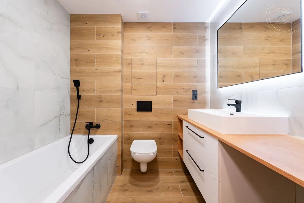 • Stylová koupelna s vanou, velkoformátovými obklady v dekoru mramoru, novým sanitárním vybavením, skříňkou pod umyvadlo, zrcadlem a WC