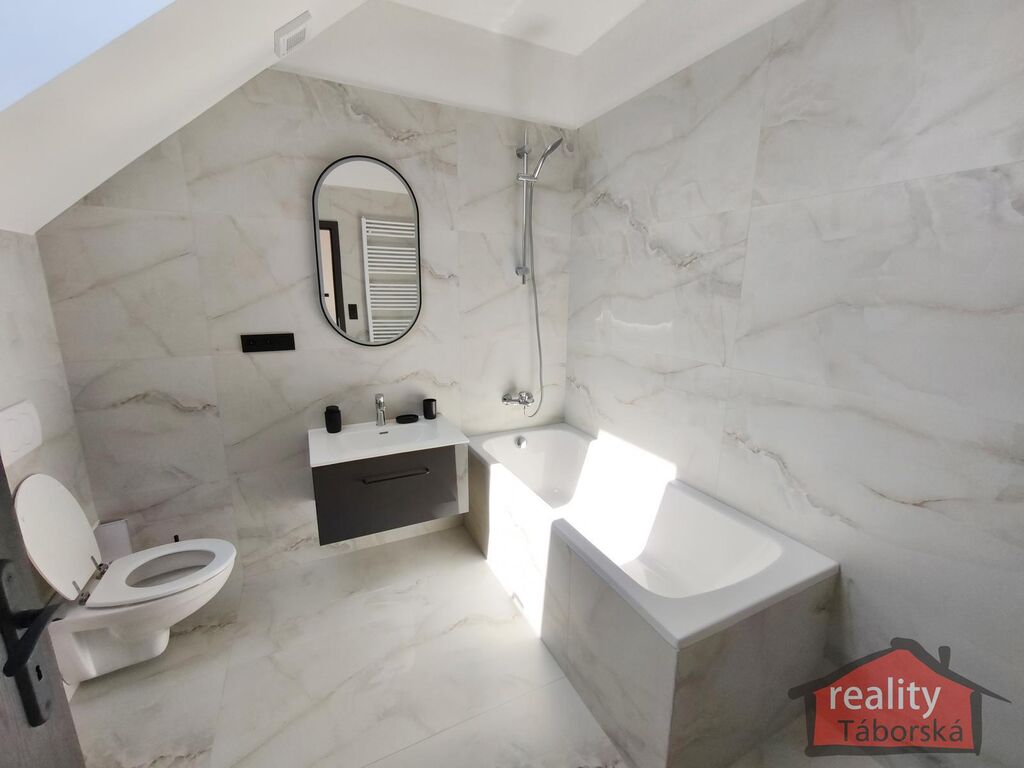V obývacím pokoji s kuchyňským koutem a ložnici je laminátová plovoucí podlaha, v koupelně keramická dlažba. V koupelně je vana, umyvadlo, toaleta a prostor na pračku s připravenými vývody na vodu a odpad. Provedení ve standardu, není potřeba dokončovacích prací. V bytě jsou dřevěná střešní okna a bezpečnostní vstupní dveře, které jsou uvnitř foliované. Vchodové dveře do domu mají bezpečnostní zámek ovladatelný z mobilního telefonu.