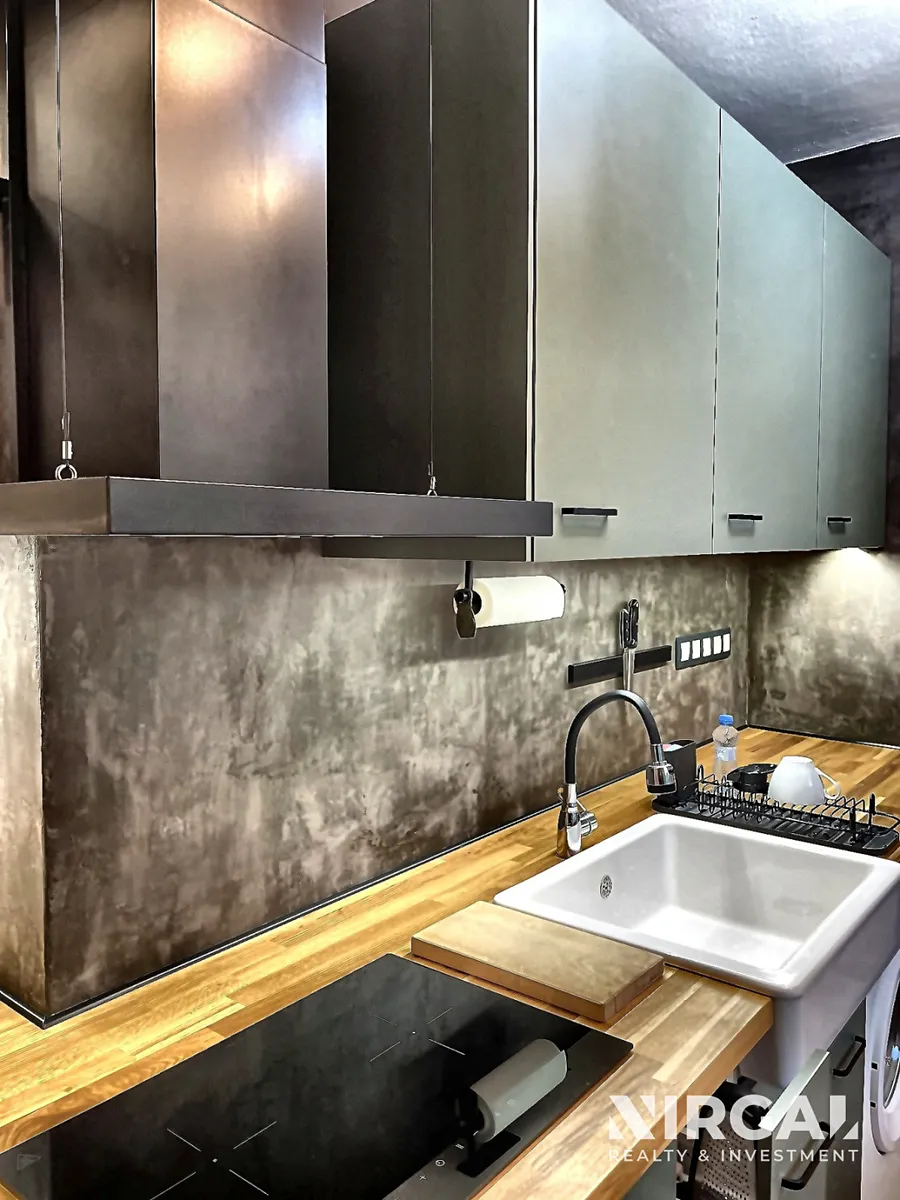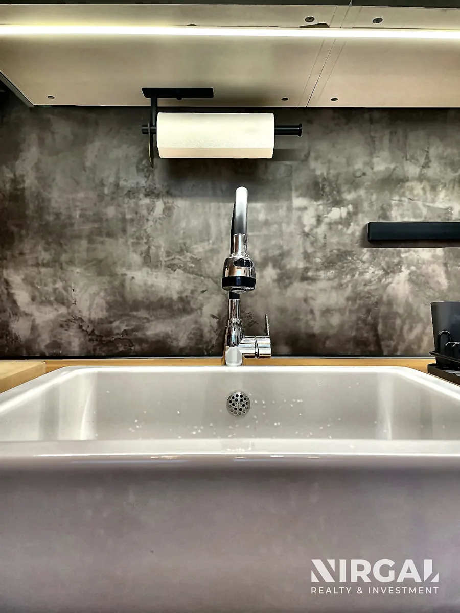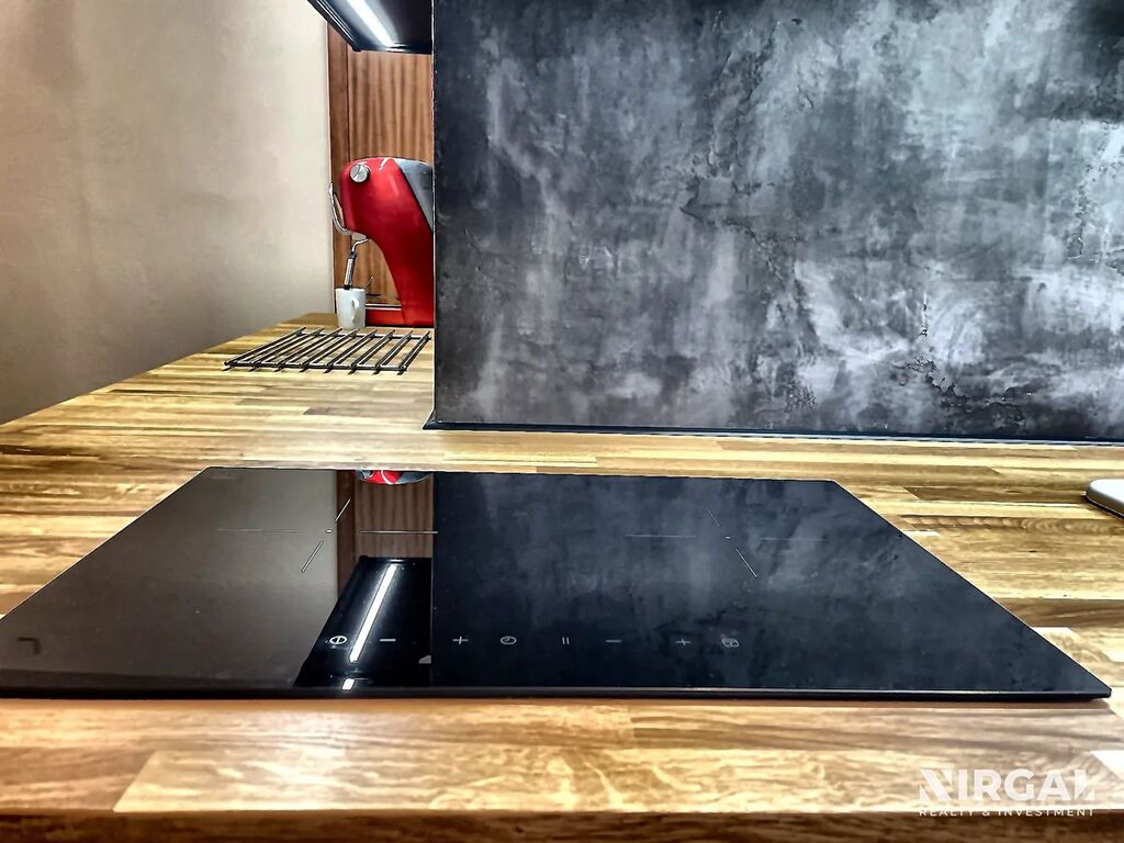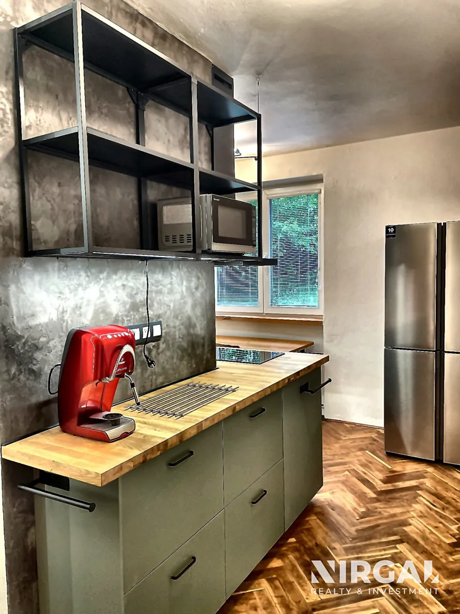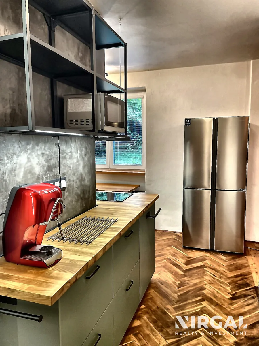 Interiér laděný v jemných tónech nabízí harmonii a dostatek přirozeného světla. Otevřený obytný prostor plynule přechází do kuchyně a jídelní části, ložnice je orientována do klidné ulice. Každý detail působí promyšleně – od designového obkladu kuchyně až po vestavěné úložné prostory z masivu. Ve vybavení bytu nechybí americká lednice s mrazákem, indukční varná deska s digestoří, myčka, pračka ani kávovar.