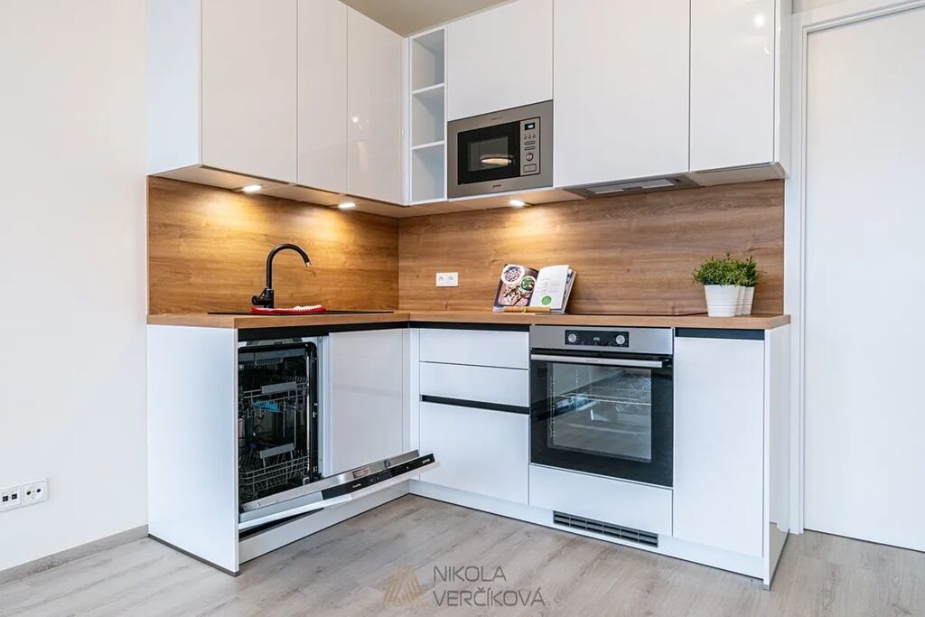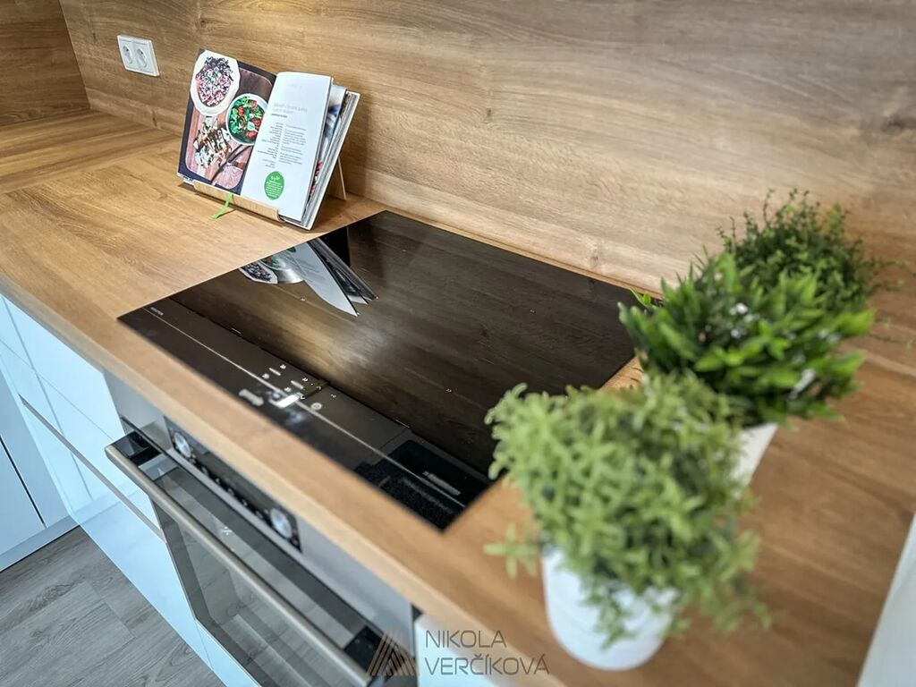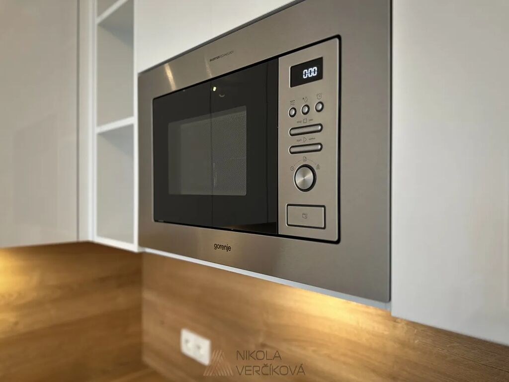 Kuchyňská linka je vybavena indukční varnou deskou, digestoří, elektrickou troubou, mikrovlnkou a myčkou. V chodbě je vestavěná skříň a po dohodě je možné zajistit i pračku nebo ledničku. Komfort bydlení zvyšuje klimatizace, která zajišťuje příjemně teploty po celý rok a dále také vlastní rekuperační jednotka.