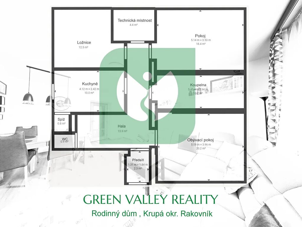 Nabízíme Vám k prodeji rodinný dům v obci Krupá u Rakovníka. Dispozičně je dům řešen jako 3 + 1 (obývací pokoj, ložnice, pokoj, koupelna, kuchyně se spíží, WC, technická místnost, hala a předsíň) s užitnou plochou 95 m². K hlavní stavbě náleží 2 samostatné garáže – (jedna upravena na kancelář a opatřena klimatizací), bývalé chlévy a další budovy vhodné pro skladování či úpravu pro kryté sezení. Na vyvýšeném pozemku za domem je instalován krytý bazén 7x2 m s možností výhřevu samostatným tepelným čerpadlem. Celková plocha pozemku vč. zastavěné plochy činí 926 m². V letech 2021 až 2024 byla hlavní budova rekonstruována. Bylo instalováno tepelného čerpadlo (vzduch – voda) sloužící pro vytápěné celého objektu a ohřevu teplé vody se zásobníkem na 160 l. Proběhlá pokládka podlahových krytin (vinyl, dlažba) v koupelně s elektrickým podlahovým vytápěním, instalace podhledů a zateplení stropů, rozvodů elektřiny vč. rozvaděče, kompletní rekonstrukce koupelny a toalety, instalace interiérových dveří vč. zárubní. Změnou též prošla kuchyně, kde kromě stavebních úprav (vstupní dveře na zahradu) došlo instalaci nové kuchyňské linky vč. vestavěných spotřebičů. V ložnici byla instalována klimatizační jednotka. Dům je napojen na obecní vodovod a kanalizaci. Na pozemku se nachází též studna a plynová přípojka, která však momentálně není využívána.
